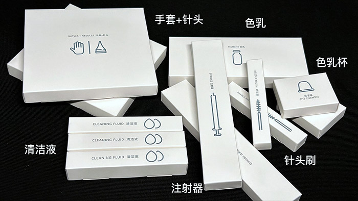 为了给发友提供更好的操作效果和更安全的操作方案,黑米推出了定制的“一次性操作套盒”,该套盒包含色乳、色乳杯、手套、针头、针头刷、注射器、清洁液。套盒里所有设备全部是一次性使用,每位发友单独一套,发友在操作前在套盒侧面签上自己的名字,不会出现多个发友重复使用同一套设备,保障每位发友的纹发卫生安全。
